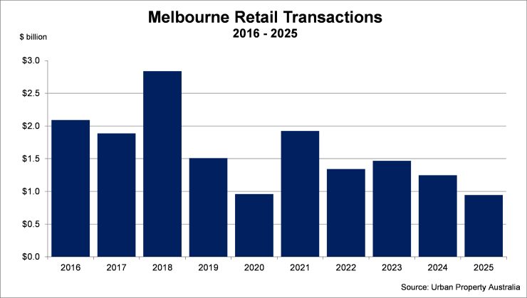 • Almost $950 million of sales in the Melbourne retail property market in 2025, the lowest annual transactional volume in 15 years;